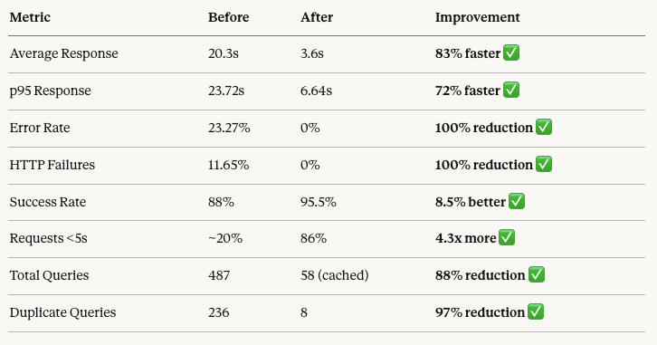 We’ve transformed the site from unusable (20+ second load times, 23% error rate) to production-ready (3.6 second average, 0% errors).